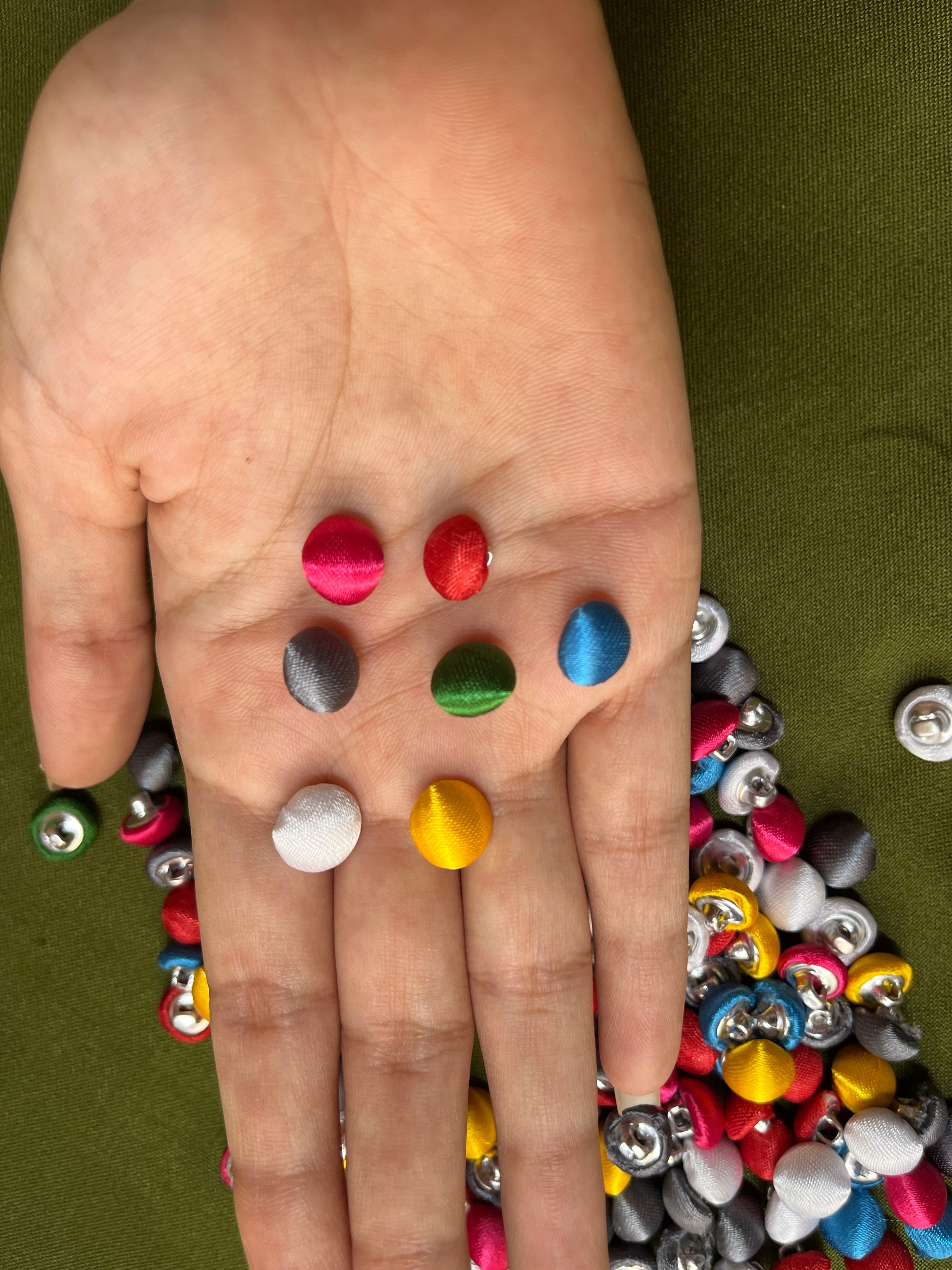 The buttons are made of Shamooz fabric. These can be used on clothes, coats and even for decoratio. These come in a pack of 12 (1 dozen) or more.